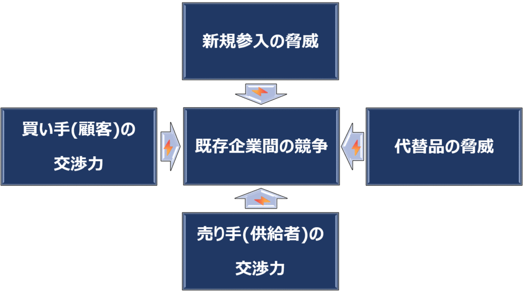 業界内の収益性は、以下の「5つの競争要因(Force=力、脅威)」によって決まるとされています。